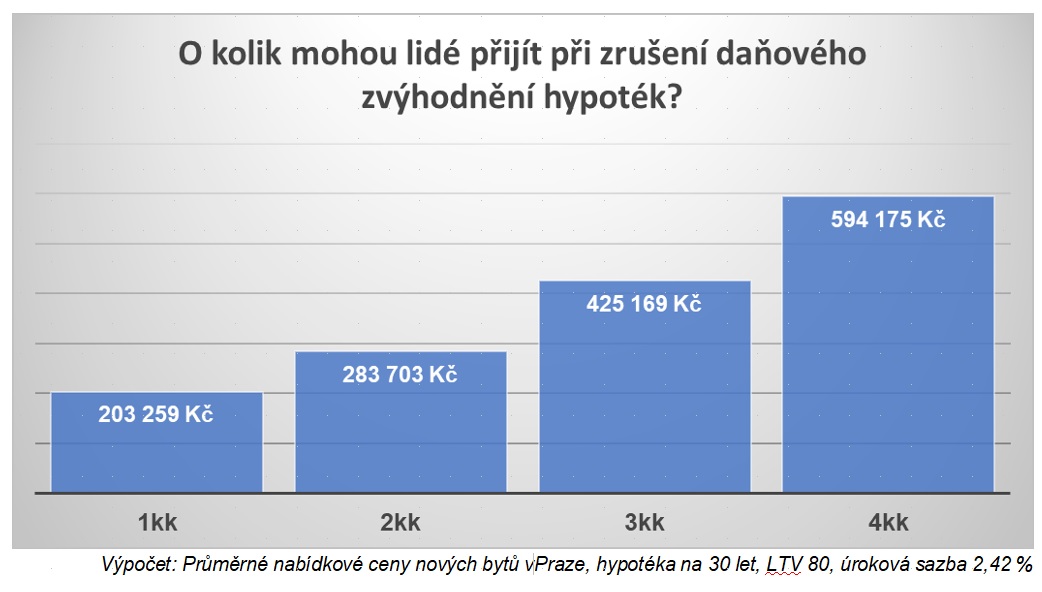 Pokud by bylo vedle zrušení daně z nabytí nemovitosti schváleno i zrušení daňového zvýhodnění u nových hypotečních úvěrů, v praktickém dopadu pro kupující nových bytů by to bylo jednoznačně negativní. V podstatě by se jednalo o novou překážku, která zastavení současné paralýzy nové výstavby rozhodně nepomůže a krizi dostupnosti bydlení jen prohloubí. U průměrného nového bytu v Praze v hodnotě 7,2 milionů korun by na daňových úlevách přišli lidé o více než 300 tisíc korun!